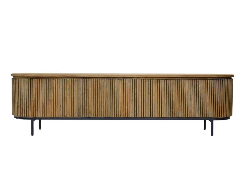 Entdecken Sie die raffinierte Eleganz der Schränke der Livingfurn-Kollektion Lausanne, einer luxuriösen Schrankserie aus langlebigem Teakholz, die mit einem eleganten schwarzen Stahlsockel ausgestattet ist. Charakteristisch für diese Kollektion sind die ovale Form und das Zusammenspiel der Linien, kombiniert mit dem natürlichen Aussehen des Teakholzes und den grifflosen Türen, die sich nahtlos in das Design einfügen. Diese schlichte Ausführung schafft einen minimalistischen Look, der der natürlichen Schönheit des Teakholzes voll gerecht wird.