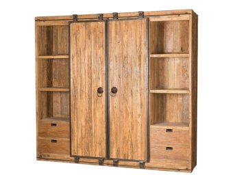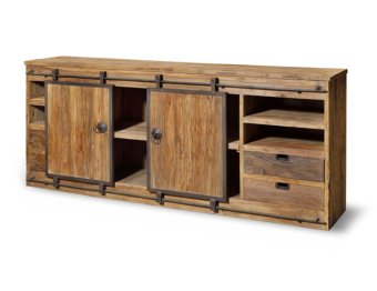 Der TV-Schrank besteht aus recyceltem Altholz kombiniert mit schwarzem Stahl, was ihm ein robustes und industrielles Aussehen verleiht.