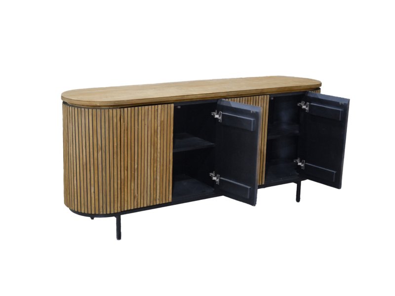 Entdecken Sie die raffinierte Eleganz der Schränke der Livingfurn-Kollektion Lausanne, einer luxuriösen Schrankserie aus langlebigem Teakholz, die mit einem eleganten schwarzen Stahlsockel ausgestattet ist. Charakteristisch für diese Kollektion sind die ovale Form und das Zusammenspiel der Linien, kombiniert mit dem natürlichen Aussehen des Teakholzes und den grifflosen Türen, die sich nahtlos in das Design einfügen. Diese schlichte Ausführung schafft einen minimalistischen Look, der der natürlichen Schönheit des Teakholzes voll gerecht wird.