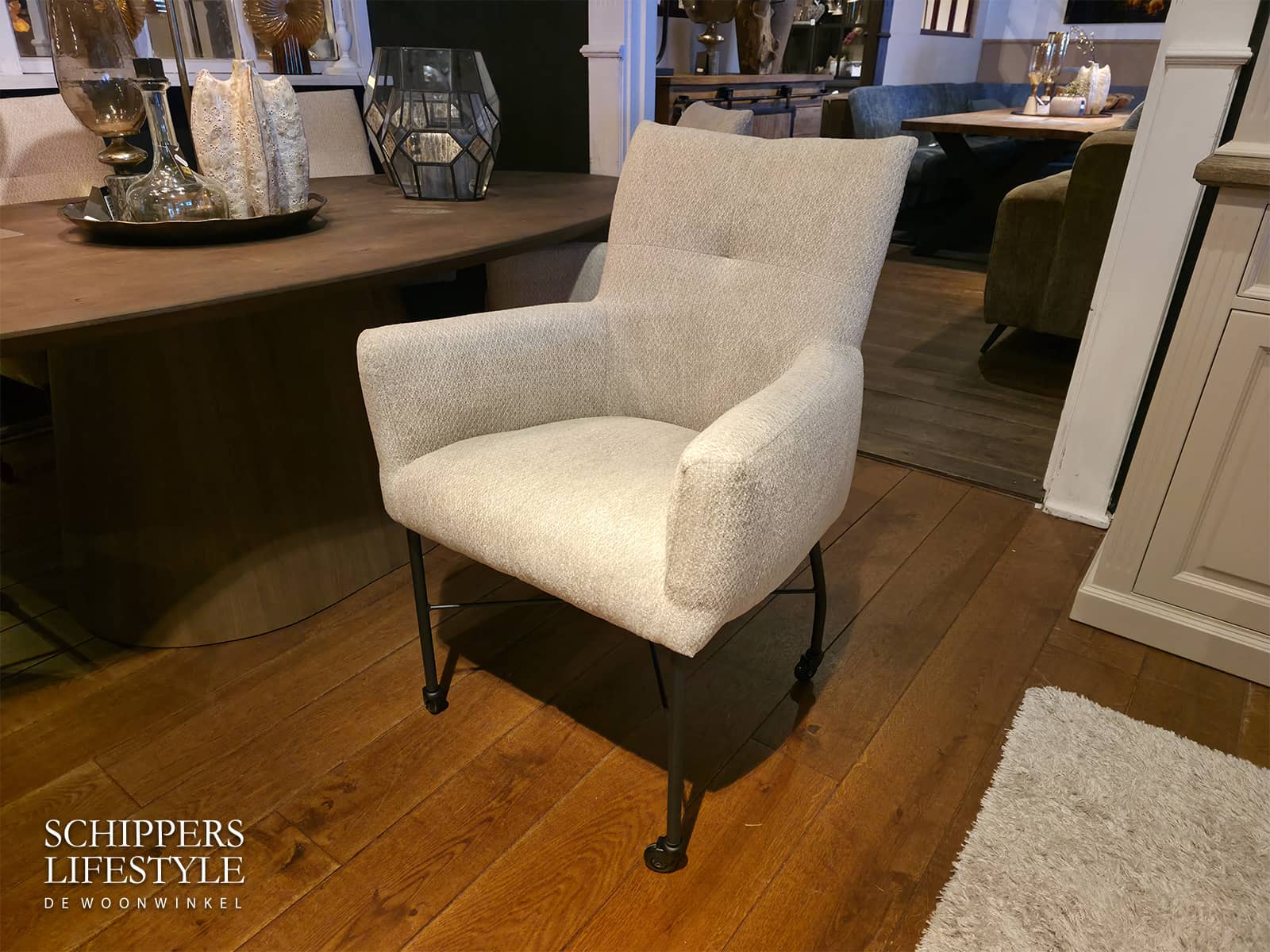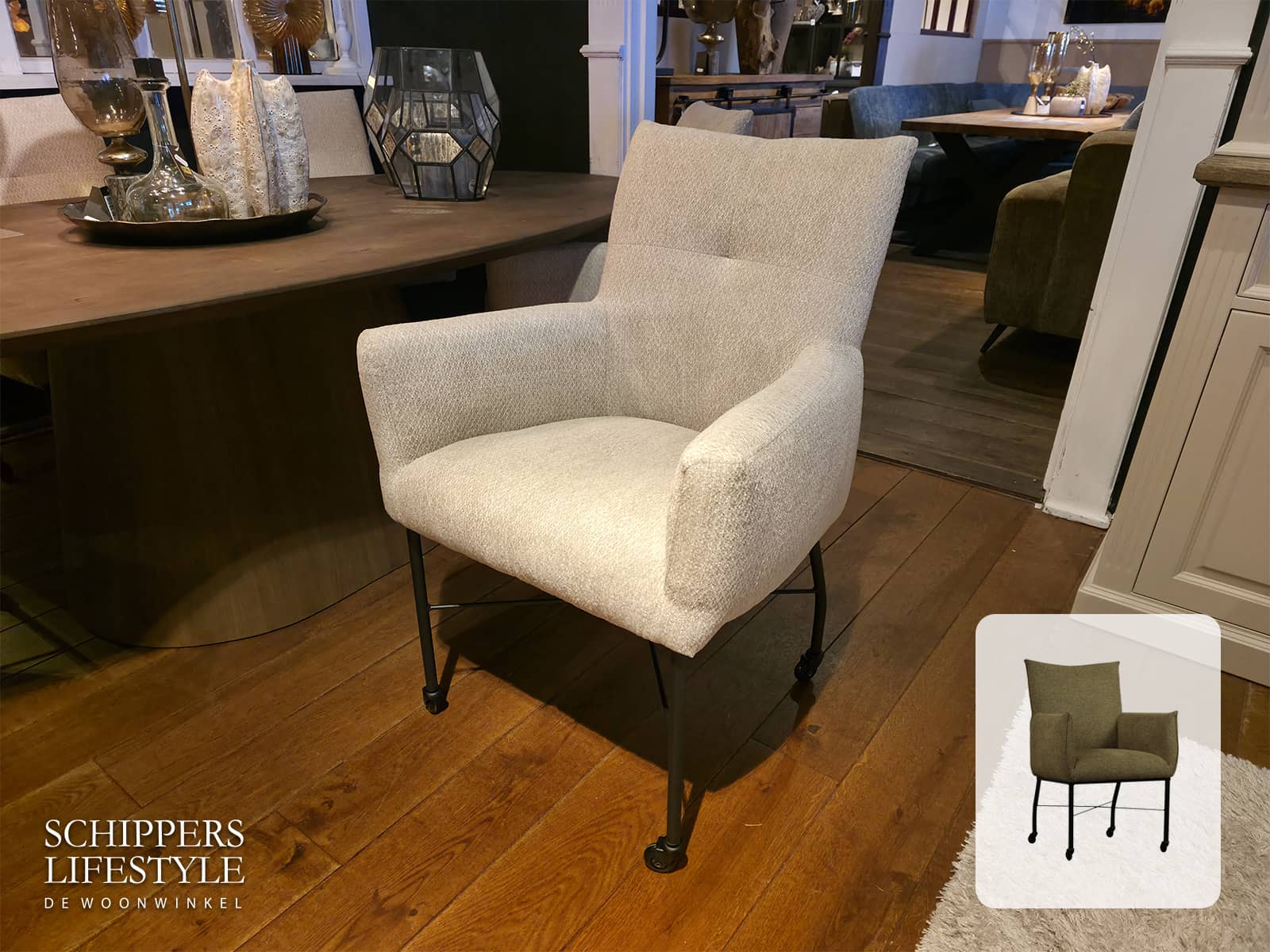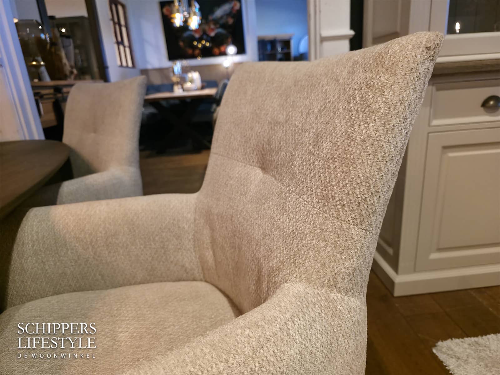 Luxe eetkamerstoel Marleen kan geleverd worden met of zonder armleuningen. Kom de complete set bekijken in onze toonzaal in Enschede. Voor onze Duitse klanten is het 3 km over de Nederlandse grens bij Schippers Lifestyle in Enschede. Kom langs voor een kop koffie en kijkt u even rustig rond.