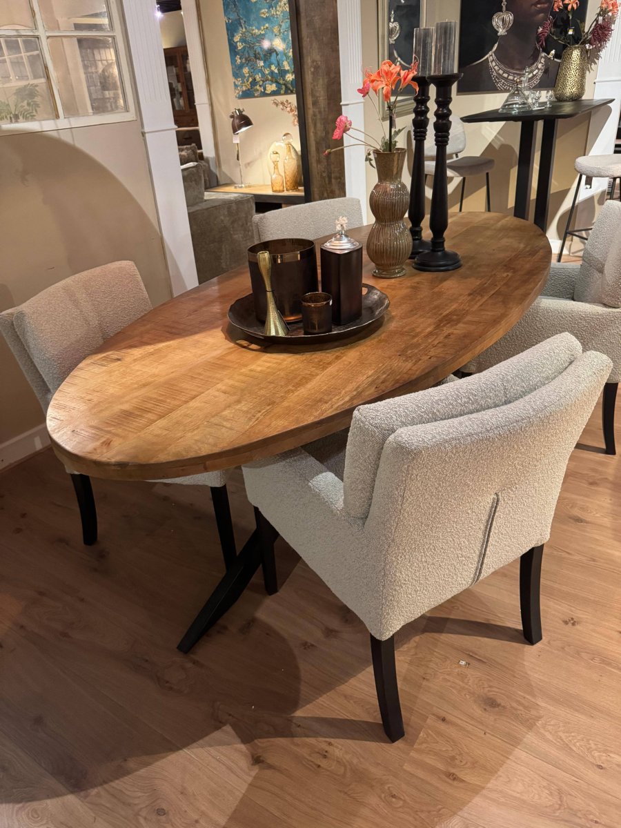 Breng warmte en karakter in je interieur met deze prachtige ovale mango tafel. Het massieve tafelblad van 4 cm dik mango-hout zorgt voor een robuuste, natuurlijke uitstraling. De elegante spinpoot geeft de tafel een moderne en luchtige touch, waardoor hij perfect past in zowel een industrieel als een eigentijds interieur.