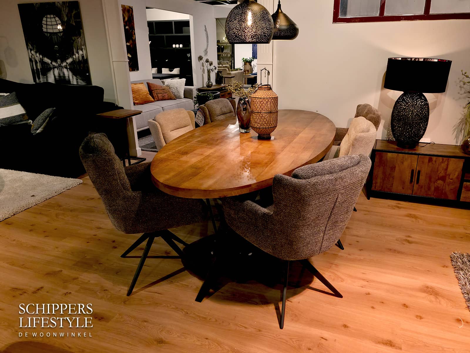 Met zijn royale afmetingen biedt deze tafel ruimte voor gezellig tafelen met familie en vrienden. Dankzij de combinatie van het unieke hout en het stijlvolle onderstel haal je een echte blikvanger in huis.