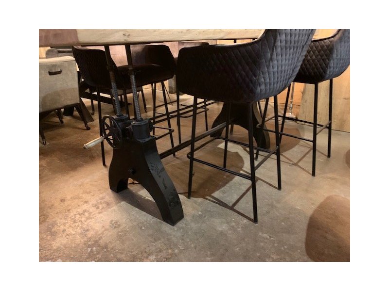 Stoere industriële houten eetkamertafel verkrijgbaar met verschillende tafelbladen, waaronder eiken, teak en elk. De eetkamertafel is voorzien van een verstelbaar fabrieksonderstel en is direct uit voorraad leverbaar. Wij leveren gratis in de regio van Enschede.